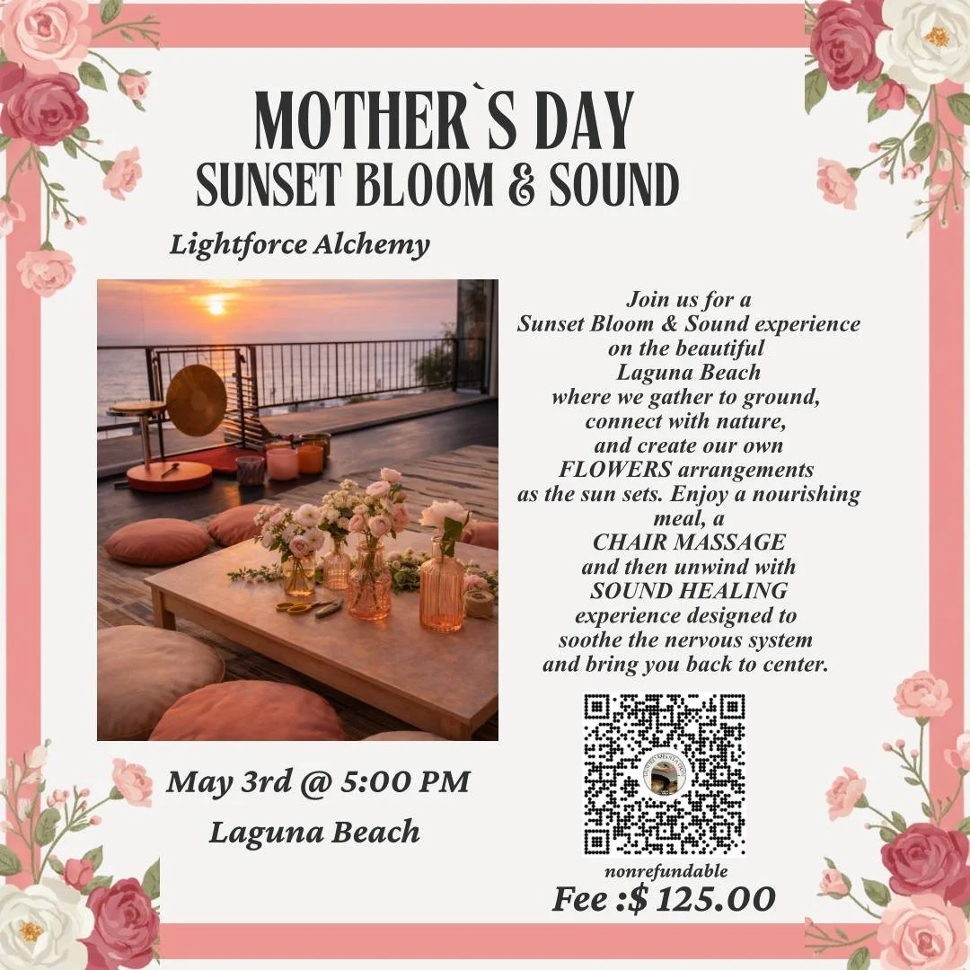 Description: Join us for an unforgettable experience where we gather to ground, connect with nature and create our own FLOWERS arrangements as the sun sets. Enjoy a nourishing meal, a CHAIR MASSAGE and then unwind with SOUND HEALING experience designed to soothe the nervous system and bring you back to center.